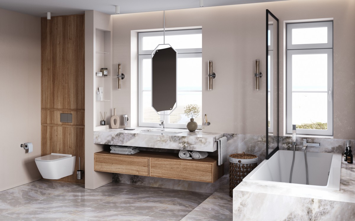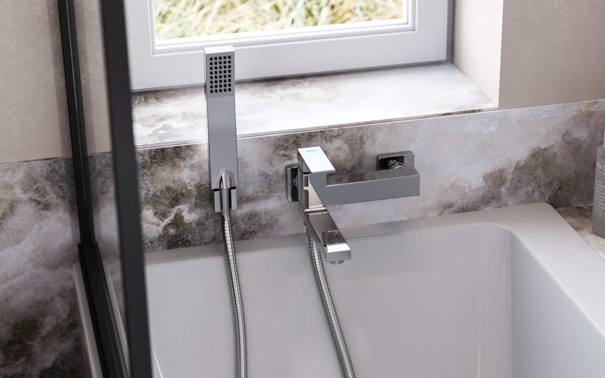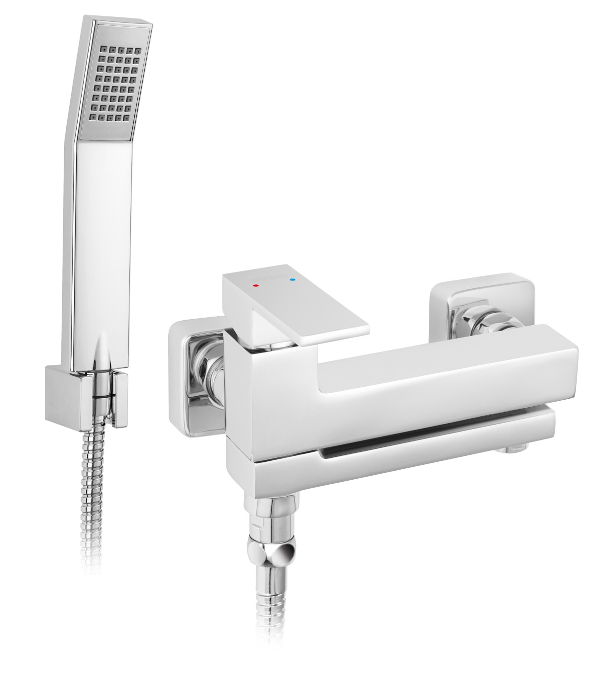 Charakterystyczna, kwadratowa bryła baterii sprawia, że jej dizajn doskonalone pasuje do nowoczesnego wnętrza. Bateria wyposażona jest w ruchomą wylewkę, która pełni jednocześnie funkcje przełącznika. Dzięki takiemu rozwiązaniu zyskujemy oszczędność miejsca co umożliwia nam zastosowanie tego produktu również w małych kabinach natryskowych. W komplecie znajdziemy prostokątną, modną 1-funkcyjną rączkę natryskową, trwały wąż prysznicowy w oplocie z metalu oraz uchwyt.