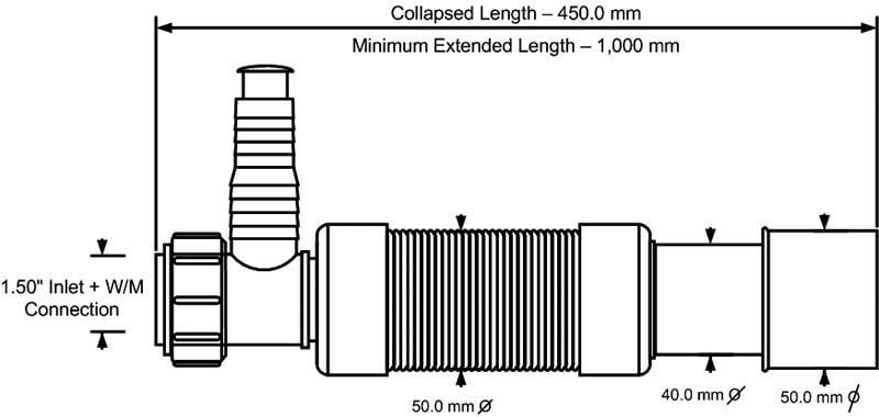 Złączka montażowa harmonijkowa L-1000mm 11/2"x40/50mm z podłączeniem pralki lub zmywarki