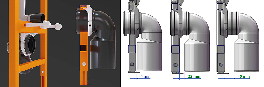 Kolano DN 90/110 do stelaży podtynkowych WC pozwala na zamontowania go w trzech pozycjach, dzięki czemu dużo łatwiej dopasować je i położenie stelaża do odpływu kanalizacyjnego. System połączenia ze stelażem jest prosty i pewny, a kolejne pozycje kolana różnią się o 18 mm. Odległość od wewnętrznej płaszczyzny ramy stelaża może wynosić 4, 22 lub 40 mm.